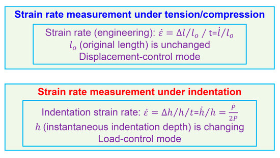 Differences between strain rate sensitivity measurement under tension/compression and nanoindentation. Different from measuring the dimension change of tension and compression specimens, nanoindentation quantifies the strain from a combination of load and indentation depth.