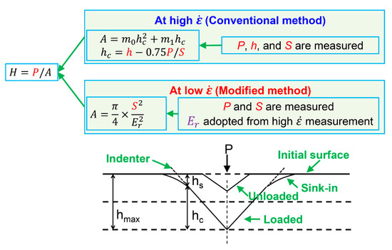 Flowcharts illustrating differences between conventional and modified methods. The conventional method measures h, P, and S at different strain rates (). Values of hc, A, Er, H, and E can be derived. The modified method first determines Er at high , then applies Er as a known parameter at lower . The h and A value at low can be calculated instead of directly measured to reduce the thermal-drift effects.
