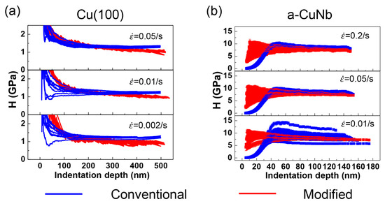 Comparison of nanoindentation results obtained from conventional (blue) and modified (red) methods using the same sets of indentation data at various strain rates for (a) Cu and (b) amorphous CuNb. At a high strain rate (0.05 s−1), the indentation hardnesses calculated from both techniques are similar. However at low strain rate, the conventional analysis leads to more scattered results.