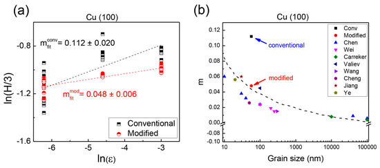 The SRS values of Cu film were calculated by using the hardness obtained at a depth of 300 nm from the two methods under different strain rates. As shown in Figure 4a, the SRS value (m = 0.048 ± 0.006) produced from the modified method (half-filled red circles) are less scattered than he conventional method. In contrast, the conventional method (half-filled black squares) leads to relatively erroneous and unacceptable SRS values (m = 0.112 ± 0.020), which are more than twice that of the modified method.