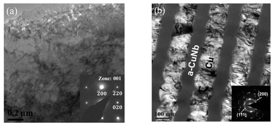 After the new technique is validated through Cu films and returns expected SRS values, the SRS of C/A multilayers can be easily determined. Thus, in this section, the relationship between individual thickness (h), the plastic deformation mechanism, and the SRS of Cu/a-CuNb multilayers with different individual layer thickness (h, ranging from 5 to 150 nm) are systematically discussed. The image in Figure 5b is the cross-sectional microstructure of Cu 100 nm/a-CuNb 100 nm multilayers (referred as Cu/a-CuNb 100 nm) characterized by TEM. The layered structures can be clearly distinguished, and the selected area diffraction (SAD) pattern in the lower right corner shows diffuse diffraction halo and diffraction spots which represent the featureless amorphous layer and polycrystalline Cu layers, respectively.