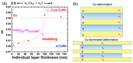 For the SRS of Cu/a-CuNb multilayers, we take the previously measured SRS of the 1.5 μm Cu film (m = 0.048, assuming that m does not change in this regime) into Equation (6) and treat ma as a value close to zero, then we can qualitatively discuss the relationship between m and h. As shown in Figure 6a, the modeled curve (dashed line) indicates the evolution of co-deformation of both Cu and a-CuNb. In addition, the SRS of a-CuNb, Cu, their average value (dotted lines) and Cu/a-CuNb are also plotted on the graph.