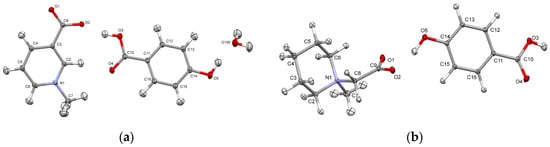 The standard resolution, room temperature structures of 1 and 2 have been previously reported by Dega-Szafran et al. [6,7]. No phase transition with the temperature change was observed, so the general features of structures at 100 K are basically the same as those of room-temperature ones. Co-crystal of trigonelline with p-hydroxybenzoic acid 1 crystallizes in the monoclinic P21/c space group with additional water molecule in the asymmetric part of unit cell (Figure 1a). The asymmetric unit of 2, which crystallize in triclinic P-1 space group, comprises N-methylpiperidine and p-hydroxybenzoic acid molecules (Figure 1b). In neither crystal structure was the hydrogen transfer observed, so in principle there were only neutral species in the crystals.