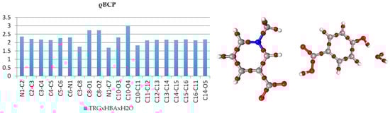 Moreover, the aromatic rings in TRG and HBA molecules are involved in weak aromatic π-π stacking (parallel displaced) interactions, characterized in Table 2. In 2, (3,−1) CPs, and corresponding bond paths were found for sixteen additional contacts: C-H∙∙∙C, H···H, van der Waals. One of the strongest contacts is H∙∙∙H interaction with the highest values electron density at the CP (>0.05 e/Å, cf. Table 3, Figure 12). Electrostatic in nature C-O···C=C interaction between antiparallel HBA molecules can be identified in 2.