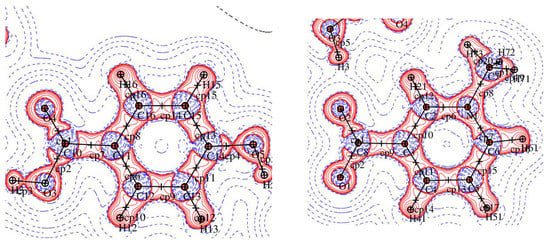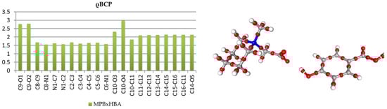 Analysis of covalent bond (and also other interactions) was performed using Atom-in-Molecules (AIM) theory [5], according to which different features of the can be analyzed in terms of topological features of total electron density field (gradient field, Laplacian, critical points, ellipticites etc.). The bond critical points (BCPs) for chemical covalent bonds (3,−1) were found and characterized (cf. Supplementary Tables S3 and S4.). In both of the structures, topological features of HBA molecules are typical. In both molecules, the most negative values of Laplacian, ∇2ρ, and the highest ρ values were found for C10-O4 double bonds, these CPs are significantly shifted towards the carbon atom. Critical points of carbon-carbon bonds in the aromatic ring lie, in a good approximation, in the middle of the bonds with total electron density ρ in the range 2.12–2.18 e/Å3 in 1 and 2.10–2.14 e/Å3 in 2; in both molecules, the Laplacian values are almost equal: 18.4 ± 1 e·Å−5. These features, along with the elasticities, are consistent with aromatic delocalized bonding, as expected. In the betaine molecules, the charge distribution is more asymmetrical. In 1, all of the carbon-nitrogen BCPs are moved towards the carbon atoms (Figure 2 and Figure 3); also, next-to-nitrogen C-C bonds are less symmetric, and the C4 C5 CP has the smallest ρ value at the CP of all the aromatic bonds in the molecule. The smaller values of ∇2ρ and ρ for Car-Car as compared with aromatic Car-N bonds suggest that less electron density is contracted in these areas. In carboxylate group, the distances C8-O1 and C8-O2, as well as the densities in appropriate BCPs, are almost identical, only the Laplacian values differ slightly (33.13 vs. 31.75 e·Å−5). In the case of MPB, BCPs for C-N bonds in the piperidine ring are also, as expected, shifted toward carbon atoms (Figure 4 and Figure 5). The electron densities at the BCPs of C-C bonds are larger than at C-N bonds. Electron density and Laplacian values at the BCP related to C2-C3 bond are 1.68 e·Å−3 and 9.31 e·Å−5, respectively, these values are about 0.11 e·Å−3 and 2.15 e·Å−5 higher than those found for N1-C2 bond in the same ring.