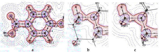 Laplacian of the electron density in fragments of 2: (a) p-hydroxybenzoic acid, (b) C2-N1-C6 plane, and (c) C7-N1-C8 plane.