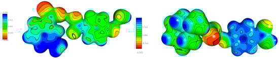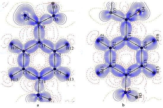 The electrostatic potential plots are shown in Figure 14. The most noteworthy difference is observed for p-hydroxybenzoic acid. In 1, the phenyl ring is close to neutral, whereas in 2, it has evident positive value (consistently with the mentioned above partial charge transfer from ‘base’ to ‘acid’). This dissimilarity is a consequence of the stacking interaction p-hydroxybenzoic acid is involved in. The most negative potential, in both structures, is located in carboxylic group, particular on oxygen atoms not involved in hydrogen bond. Its values for individual compounds do not differ remarkably.