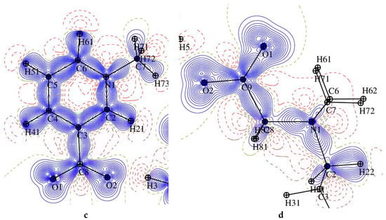 The quality of the refinement results was validated by low values of Hirshfeld rigid bond test (cf. Supplementary Materials), [22] with the highest values (ΔZAB2)—in both structures for N1-C7 bond-equal 6 × 10−4 (1) and 5 × 10−4 (2), as well as by residual density analysis (RDA [23]) for the final model. This latter method, based on the fractal dimension of the residual electron density map, is used to detect the systematical errors and to provide quantitative description of the deficiencies of the model. After an appropriate refinement it should be “flat and featureless”. Graphical representations show (Supplementary Materials) that the plots for both 1 and 2 are symmetrical and regular, thus indicating the absence of serious systematic errors. All static, residual, dynamic, and deformation maps were analyzed using MoproViewer software [19].