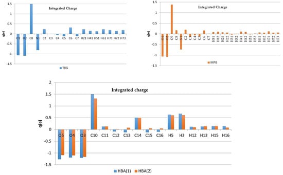 Oxygen atoms in carboxylate groups have almost equal negative charges in both of the complexes, about −1.07 e (Figure 7, Tables S5 and S6), while the other oxygen atoms are even more negatively charged (from −1.09 e to −1.27 e). Of course, the zwitterionic nature of the molecule, even though not being observed in individual atom charges, can become clearly visible when groups of atoms are considered (Figure 8). So, partitioning the TRG and MPB molecules into parts that are related to N and COO− charges shows that fragment containing quaternary ammonium nitrogen atom is substantially more positive, and the carboxylate groups-negative (Figure 8). Interestingly, total atomic charges for the molecules constituting the molecular complex are close to 0 in 1 (TRG = 0.12 e, HBA = −0.12 e), while in two appropriate values (MPB = −0.48 e, HBA = 0.48 e) suggest some amount of charge transfer between the molecules. All of the atomic charges that are discussed here were obtained by integration over atomic basins; supplementary material also contains charges that are obtained as Nval–Pval differences between the numbers of valence electrons (formal) and refined valence populations.