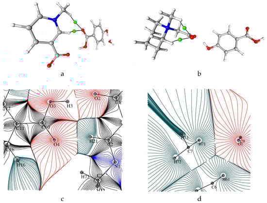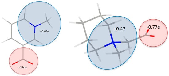 In the case of betaine zwitterions, the atomic charge distributions are one of the most interesting issues; consequently, the partition of the charge between the quaternary ammonium and the carboxylate groups was also analyzed. To some extent, surprisingly, the charges reflect rather non-zwitterionic nature of TRG and MPB, since the positive charge is not concentrated at the nitrogen (q(N) = −0.81 e for 1 and q(N) = −0.74 e for 2), but is rather delocalized over the ring (similar effect has been observed in experimental charge density studies previously [24]).