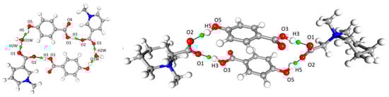 The static deformation density maps (Figure 6), show expected features, as consistent with the topological analysis: accumulation of electron density in the bonds of aromatic rings is in both of the structures larger than in piperidine one, strong polarization of electron density in C-O bonds (in COO− groups) towards the C atoms. One electron lone pair (LP) for O3 and O5 oxygen atoms, and two for O1, O2, and O4 atoms two LPs have been found in both complexes. It might be noted, that the deformation electron density within the lone pairs is not uniformly distributed—the result of the differences in intermolecular interactions (hydrogen bonding) in which these atoms are involved (these negatively charged atoms are excellent H-bonds acceptors). On the second end of the atomic charge spectra, in both of the structures the most positively atoms are carbon atoms of the carboxylate group (C8 (1), C9 (2), Figure 7).