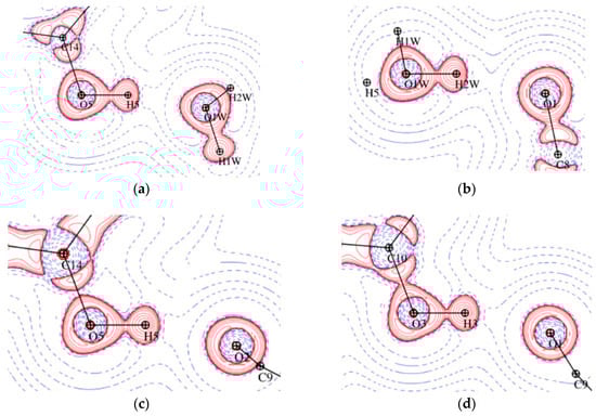 Representation of O-H···O hydrogen bonds in Laplacian maps for 1 O5-H5···O1W plane (a), O1W-H2W···O1 plane (b) and for 2 O5-H5···O2 plane (c), O3-H3···O1 plane (d), logarithmic contours in e Å−5. Red and blue contours denote positive and negative values, respectively.