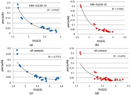 The exponential dependences of the total electron density, Laplacian, the main curvature (λ3) at the BCPs on the D12 distance, were examined for both complexes (Figure 13 and Supplementary Materials, Figures S6 and S7). The best exponential fitting for hydrogen bonds (both strong OH∙∙∙O, and weak CH∙∙∙O) was found for λ3, ∇2ρ (with the correlation of 98% (1) /97% (2), but also for ρ(rCP) correlation is quite remarkable (95% in 1 and 92% in 2). The analogous plots were drawn also for all of the contacts found using conditions mentioned above. In 1, a good fit for λ3, ∇2ρ (93%, 91%) has been found while the total electron density showed the worst convergence for these contacts (77%). In second complex, for all the contacts, no clear tendency is visible, points are rather spread around and the correlation is far below acceptable fitting level for all three parameters λ, ∇2ρ, λ3 (respectively, 69%, 69%, 73%). It can be explained by the different nature of interactions that are covered by this criterion-separated curves for CH···O contacts (91% λ3, 88%∇2, 81% ρ in 2), H···H contacts (89% λ3, 86% ∇2, 76% ρ) show much better agreement. For the remaining ones (π···π, CH···π, other weak interactions), there are too few points to give any reliable conclusions.