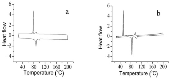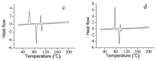 The structures of obtained compounds used in this paper are shown in Scheme 1. A POM with a heating stage and DSC were used for measuring the melting temperature (Tm) and isotropization temperature (Ti) of the compounds. DSC thermograms for compounds 2a–d upon heating and cooling cycles were shown in Figure 3. Compounds 2a–d exhibited similar phase transition behaviors. For example, in the DSC measurements of compound 2c (Figure 3c), an exothermic peak appeared at 103 °C when the compound was cooled from the molten state, confirming a phase transition from the isotropic phase to the nematic phase. Another exothermic peak at 64 °C was assigned to the crystallization. Further endothermic peaks were observed at 80 °C, which were attributed to nematic–smectic phase transitions.