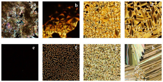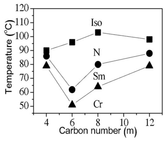 The correlation between the phase transition temperature and side chain length was summarized in Figure 5. One of the notable features was that when the side chain length changed from C4H9 to C12H25, the nematic phase temperature range was initially increased from C6H13 to C8H17. After that, a descending trend was observed when the spacer changed from C8H17 to C12H25. By contrast, in comparison to the temperature range of the nematic phase, the smectic phase temperature range had little influence on the side chain length from C4H9 to C12H25.