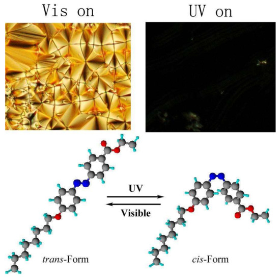 Liquid–crystalline materials have been applied for optical information displays and storage devices, as the modulation of the liquid-crystalline phase’s molecular alignment can be controlled by external stimuli, such as heat, electric fields, and light [1,2,3]. Azobenzene and its derivatives are photoisomerizable materials that undergo a reversible transformation between trans and cis isomers in the presence of light. Liquid crystals (LCs) containing an azobenzene moiety, either of low molar mass or polymeric in nature, have attracted tremendous attention as a result of their light-induced, photo-switchable, and elastic properties [4,5,6]. The introduction of reversible trans–cis photoisomerization of azobenzene can exert large effects on the properties of LCs [7,8,9,10].
