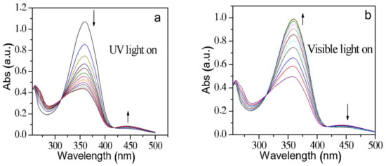 The early work has reported that LCs incorporating azobenzene moiety exhibit trans–cis photoisomerization behavior upon UV-Visible (UV-Vis) light irradiation [23,24]. Figure 6 shows the UV-induced trans–cis isomerization of compound 2c. Its reversible photoresponsive properties were well-demonstrated by in situ POM characterization. By irradiating the compound with UV light, it can be transformed from the anisotropic state to the isotropic state owing to the isomerization of azobenzene. Switching to visible light induced the expected return to the anisotropic phase. UV-Vis spectra were employed to evaluate the isomerization of compound 2c in solution during the reversible changes under alternating UV and visible light irradiation. For example, the UV-Vis spectra of compound 2c in CH2Cl2 solution are shown in Figure 7 (the concentration was 0.002 wt %). The data were obtained at a constant frequency of 30 s/time under UV light (365 nm, 3.8 mW/cm2) or visible light (12.1 mW/cm2). The compound exhibited an absorption maximum at 360 nm and weak shoulders at 440 nm, which were related to p–p* and n–p* transitions of the azobenzene trans–cis configuration, respectively [25].
