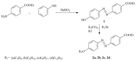 As we know, the properties of an LC depend on the chemical structure of the azobenzene and other segments [18]. With those objects in mind, we designed and synthesized a new series of azobenzene LC compounds, containing a flexible chain of CmH2m (where m = 4–12). In addition, a sequence of very interesting phase changes were observed when the compounds were assigned to different terminal groups, such as alkyloxy, alkoxy, ester, and hydroxyl. The phase behaviors of these compounds were characterized by differential scanning calorimetry (DSC) and polarizing optical microscopy (POM). The compounds of these series exhibited different phases when changing temperature. This investigation revealed that the kind of chain at the side of the azobenzene moiety plays a more important role in the formation of LC phases than has previously been understood.