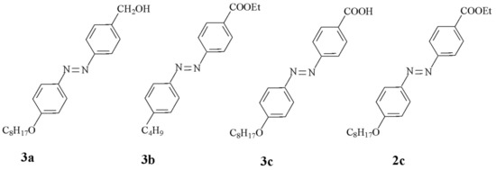 In order to study the effect of molecular structure on the formation of LCs, we synthesized some compounds which have different functional groups on sides of azobenzene (Scheme 2). It has been reported that the molecular shape and the intermolecular force were important to the formation of liquid-crystalline phases [22]. Ester and ether on both sides of azobenzene can provide appropriate molecular interactions, such as hydrophobic interactions, π-π interactions, and van der Waals forces, which will promote the bonding between the donor and acceptor of the rigid parts, and hence increase the effective length of mesogenic groups. The increased effective length of rigid mesogenic groups can lead to the easy formation of liquid-crystalline phases. By contrast, when the type of groups on sides of azobenzene were changed, structure-property relationships in LC were observed. DSC and POM results showed that no liquid–crystalline phases were detected in compounds 3a–c. This is clearly demonstrated by the fact that the covalent incorporation groups on sides of azobenzene play an important role in stabilizing the LC phase.