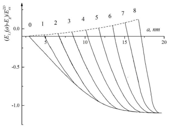 The dependence of the energy spectrum ( of the exciton (from spatially separated electrons and holes) in the states (n = 1, l = 0, 1, 2, 3, 4, 5, 6, 7, 8) (where n and l—the principal and orbital quantum numbers of the electron) (solid line) on the a radius of the aluminum oxide QD, situated in the dielectric matrix (vacuum oil). The numbers at the curves indicate the value of l. The dashed lines indicate the boundaries of the spectrum of quasi-stationary states of the exciton. Here —bandgap of the aluminum oxide QD, —the binding energy of the ground state of the two-dimensional exciton (from spatially separated electrons and holes).