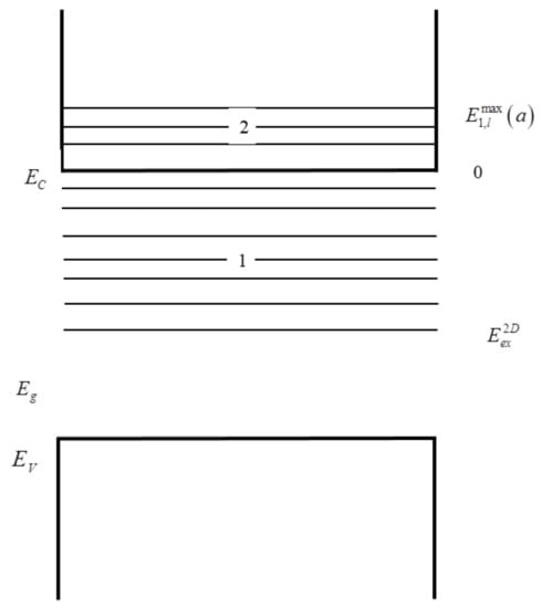 (, l = 0, 1, 2,—orbital quantum number of the electron), —width of semiconductor bandgap with ε2 permitivity. In the Hamiltonian (6), the energy of the Coulomb interaction between the electron and hole is described by the equation []: