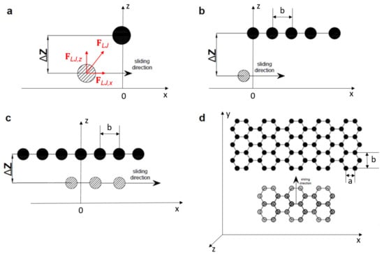 Four configurations have been considered in the following analysis, with increasing degrees of complexity. Figure 1a shows the first studied configuration, which contains one atom with a fixed position () and another one moving along the x direction. The normal distance between the two atoms is kept constant at a fixed distance or nm, in order to investigate its effect on interatomic vdW forces. As for the second configuration, the dynamics of a carbon atom sliding over a fixed chain of carbon atoms is studied, as depicted in Figure 1b. Herein, the atoms of the chain are separated by nm, that is, the distance between two hexagonal lattices of graphene. The third configuration is depicted in Figure 1c, with two chains of carbon atoms at the distance sliding over each other along x axis. Note that in the second and third configurations, the first atom of the fixed chain is positioned at . The fourth configuration considers two graphene sheets at distance (Figure 1d), the hexagonal lattice of graphene being characterized by nm (C-C bond length) and nm characteristic sizes [25,38]. Accordingly, the size () and number of atoms () of each graphene sheet can be computed as