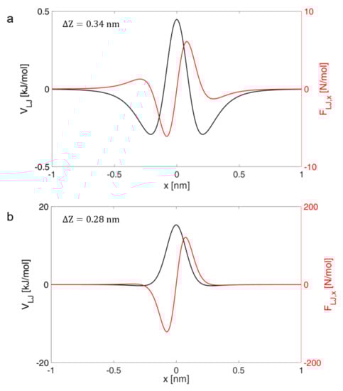In Figure 2a, the normal distance between carbon atoms is nm, which is approximately equal to the equilibrium interlayer distance of graphite. Results highlight the presence of two symmetrical stable equilibrium positions (i.e., nm), where is the minimum and . Moreover, when the sliding atom is positioned at —that is the position where the two atoms are facing each other with respect to x axis— and is the maximum (unstable equilibrium). A similar behavior is observed with nm (Figure 2b, two symmetrical stable equilibrium positions at nm); however, the shorter normal distance between atoms leads to stronger vdW interactions and, thus, up to one order of magnitude larger potential and force peaks.