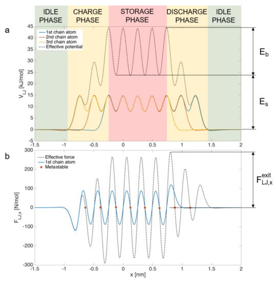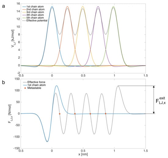 The potential between each atom of the sliding chain and the fixed ones is reported in Figure 4a, with trends similar to the atom–chain case. The resulting effective potential highlights again the presence of stable, metastable and unstable equilibrium positions throughout the motion of the sliding chain over the stationary one. In particular, the two stable equilibrium positions are still observable with chains separated nm from each other along the x axis. Conversely, unstable and metastable equilibrium positions appear with overlapping chains. Again, unstable equilibrium positions are associated with atom-atom facing, while metastable equilibrium positions emerge with alternated atoms, with periodicity determined by the chain lattice b.
