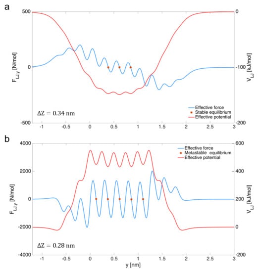 The sliding motion between the two graphene sheets depicted in Figure 1d is finally analyzed. Initially, the stationary sheet consists of 210 atoms (), while the sliding sheet consists of 30 atoms (, ). Interaction potential and effective force are calculated for interlayer spacings equal to nm or nm, in order to consider either unstable or stable configurations, respectively. The sliding motion of the sheets is only analyzed along the y axis; nevertheless, similar results could be obtained for the x axis motion as well.