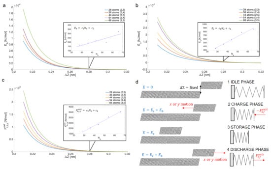 To increase the generality of such evidence, a sensitivity analysis has been carried out to assess the effect of both sliding sheet size () and interlayer spacing () on the energy barrier (, Figure 6a), storable energy (, Figure 6b), and exit force (, Figure 6c) of two graphene sheets sliding along the y direction. Results show that , , and tend to increase with lower following a power law, because of the enhanced vdW interactions at shorter distances (see Equations (1) and (2)). Furthermore, as reported in the insets for a fixed nm (although similar trends can be found with different ), , , and linearly increase with . Such behavior is coherent with the superimposition of vdW interactions between the atoms of the sliding and stationary sheets. Note that the slight deviations from this linear trend may be due to the different shape of the sliding sheets ().