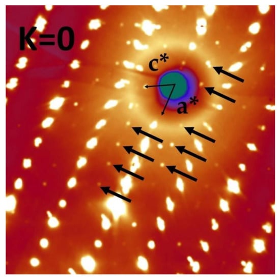We have studied the thermal evolution of the structural properties of κ-ET-Cu as a function of temperature. Importantly, the P space group is confirmed in the entire temperature range since reflections forbidden in the P21/c space group were observed from 300 to 3 K. Upon cooling to 3 K, the intensity of these reflections only slightly increased, while the overall X-ray pattern did not change significantly. In particular, no significant change was detected in the temperature range between 300 and 200 K, where, according to H1 NMR measurements [], the thermally activated jump between E and S conformations decreases, leading to the stabilization of the S conformation seen in the structural refinements [,]. In addition, no substantial modification in the intensity of the Bragg reflections was observed in the temperature range between 60 and 3 K where a relaxor-like peak is detected by dielectric measurements [,].