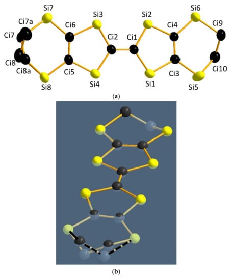 The P structure obtained is similar to the P21/c ones previously published in [,,] and more recently in [,]. In particular, the nearly flat shape of the core of the BEDT-TTF molecules is in agreement with the one expected theoretically and obtained in [] and [,,]. One can notice that, in the structure of [], the molecules are more bent than in our structure and in the structures of [] and [,,,]. In addition, typical distances of the Ci1–Ci2 double bonds (defined in Figure 2a and given in Table 1) of our structure are consistent with those expected for BEDT-TTF molecules with a +1/2 charge (half-hole) and those obtained in the refinements of [] and [,,,], while in [] these distances are significantly larger.