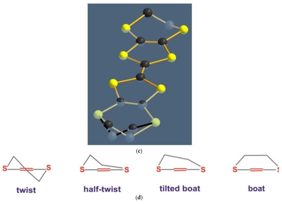 Importantly, our density map indicates that, at room temperature, ethylene groups are slightly disordered. This is particularly the case of the Ci7–Ci8 groups (defined in Figure 2a), which are the closest ethylene groups to the disordered C–N groups. The ethylene groups of the BEDT-TTF molecules at 300 K are thus rather in a staggered twist conformation on each side of the molecule. The twist configuration presents the one of the lowest energy values for an isolated molecule [,] (see Figure 2d) as does that obtained by ab initio calculations in a similar compound []. This finding contrasts with the conclusion of refinements of [,] where an ordered configuration of the BEDT-TTF molecule was found at room temperature. These last refinements give a half-twist conformation of the ordered ethylene groups (see Figure 2d), which is not a conformation with the lowest energy. Note that a half-twist conformation was observed in BEDT-TTF molecules of salts exhibiting structural instabilities, such as α-(BEDT-TTF)2I3 and α-(BEDT-TTF)2KHg(SCN)4 salts []. The origin of the half-twist conformation of the ethylene groups in these salts seems to be due to the presence of constraints exerted by the environment of the BEDT-TTF molecules, i.e., the mechanical constraints due to the geometry of hydrogen bonds established with the anions.
