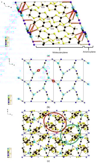 Concerning the hydrogen bonds between the electropositive H atoms from the ethylene groups and the electronegative atoms of the anionic stack, their presence in organic systems is very frequent. It is an important structural effect that controls the packing of the BEDT-TTF layer and which is essential to stabilize various instabilities such as the CO ground state [,]. In the case of κ-ET-Cu, hydrogen bonds between the electropositive H atoms of the ethylene groups and the electronegative N or C atoms of the anionic stack are shown in Figure 3a. If one analyzes the hydrogen bond network between the BEDT-TTFs and the atoms of the anionic polymeric network shorter than 2.8 Å, it appears that the BEDT-TTFs of both dimers, when they are staggered, make two hydrogen bonds with N atoms (2.69 and 2.73 Å for Donor 1 and 2.68 and 2.75 Å for Donor 2) and another one with one of the atoms of the disordered CN group (2.74 Å for Donor 1 and 2.73 Å for Donor 2). When the donors are eclipsed they make two hydrogen bonds with N atoms (2.69 and 2.70 Å for Donor 1 and 2.69 and 2.68 Å for Donor 2) and another one with the C atoms (2.61 Å for Donor 1 and 2.55 Å for Donor 2). From these values, it is not clear if there is a net preference for the staggered conformation. The hydrogen bonds with the N atoms seem to slightly favor the eclipsed conformation. However, when both donors are staggered, they establish a short contact with the disordered CN group, whereas when they are eclipsed they establish a short contact with the less electronegative C atom. It is most likely that the interaction with the anionic network does not clearly favor one of the two conformations.