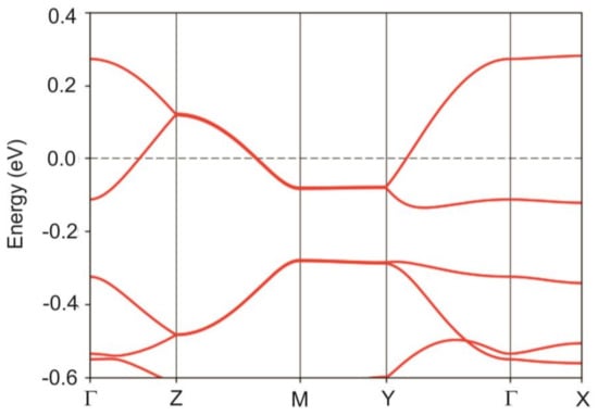 To put these results on a firm basis, we have also carried out first-principles density functional theory (DFT) calculations. The temperature dependence of the electronic structure parameters assuming a P21/c average structure was the subject of previous DFT studies [,]. Here, we are mostly interested in the magnitude of the charge difference between the two dimers. Because of the disorder of the C2–N2 and C10–N10 groups, we carried out two different types of calculation, using in both cases the crystal structure reported in this work. In the first calculation, the original P structure has been converted into a P1 structure by selecting one of the two possible orientations of the CN pair at the inversion center but leaving the rest of the structure unaltered. In the second calculation, the anionic layer is completely removed from the calculation and the neutrality of the system is enforced using a uniform background of charge amounting to two electrons per unit cell. In that way, the P original symmetry is kept. The density of holes per BEDT-TTF donor was calculated by integration of the density of states of the two upper HOMO bands and the two calculations led to the same charges. The calculated band structure for the 300 K structure is shown in Figure 4. The two upper bands are built from the anti-bonding combination of the two highest occupied molecular orbitals (HOMO) of the BEDT-TTF dimers. Figure 4 shows that these two bands nearly merge together along the Z–M and M–Y lines (there is degeneracy for the P21/c space group). The separation between these two bands along the Z–M and M–Y lines is quite weak (between 3 and 5 meV). As this separation is proportional to the difference between the two types of dimers (i.e., the difference in energy of the HOMO’s anti-bonding combination of each dimer and the difference in transfer integrals t3 and t4 between dimers of the same type along b), one obtains very similar intra- and inter-donor interactions for Dimers 1 and 2. This is confirmed by the fact that the DFT electronic structure dispersion of Figure 4 is nearly identical to the one of the P21/c structure []. As expected from these results, despite the existence of the two different dimers, the holes are calculated to be practically equally shared by the two dimers (2δ ≅ ±0.01, which is of the same order of magnitude as the precision of our calculations). The results of vibrational spectroscopy [], which do not reveal any charge imbalance larger than δ = ±0.01e, agree with the present results despite the existence of two different dimers.