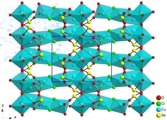 The first group of transition metal selenite halides may be described by the composition MII5(SeO3)4X2 (substances 1–5 in Table 1) [22,23,24,25]. While cobalt and nickel compounds are similar in some forms, copper compounds’ crystal structures are different. The crystal structure of Cu5(SeO3)4Cl2 is presented in Figure 1 as the projection on ab plane.