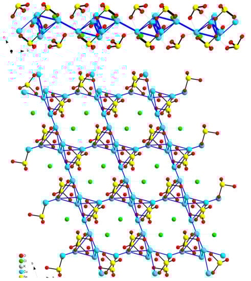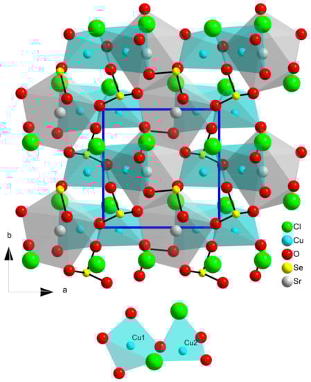 According to Shannon’s data [45] the ionic radius of Sr2+ ions is close to that of Pb2+. At the same time, according to the Periodic Table of the elements, calcium as an alkali earth metal may be a smaller analog of strontium. There were obtained compounds with compositions CaCu2(SeO3)2Cl2 and PbCu2(SeO3)2Cl2 [28,29] (Table 1 substances 9 and 11). It is apparent (Table 1) that both compounds are isostructural but have a different unit cell in comparison with SrCu2(SeO3)2Cl2 (Table 1 substance 10). At the same time, the tellurite compound PbCu2(TeO3)2Cl2 [29] is isostructural to SrCu2(SeO3)2Cl2 [27]. This phenomenon may be associated with differences in ionic radii of Se4+ and Te4+. A bigger tellurium atom is more compatible with strontium or lead, whereas the smaller selenium atom is the reason for the formation of the related calcium and lead compounds.
