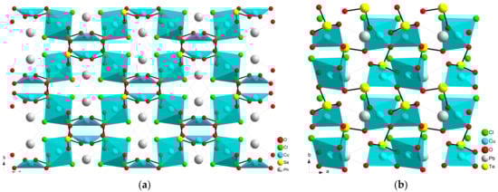 The differences in the crystal structures of these two types of compounds are shown in Figure 5, using PbCu2(YO3)2Cl (Y = Se, Te) as an example. The crystal structures of CaCu2(SeO3)2Cl2 and PbCu2(SeO3)2Cl2 contain two different copper atoms in a strongly squeezed tetrahedral [CuO4] and octahedral [CuO4Cl2] environments. In the case of octahedrally coordinated copper atoms, two oxygen atoms are situated at distances about 2.6 Å and [CuO2Cl2] may be considered as a magnetic plaquette. Calcium or lead atoms are situated in the 8-vertex polyhedrons [MO4Cl4]. Selenium atoms share common O vertexes of copper and calcium or lead polyhedra and are situated next to the holes of the framework formed by them. From data presented in [28,29] it may be seen that Cu–Cu distances are relatively long. In case of the Ca compound the distances are 3.85–4.12 Å, and for the Pb compound the distances are 3.93–4.06 Å.