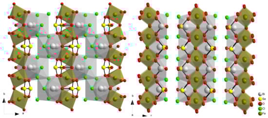 As seen from the above-mentioned data, the majority of selenite halides with described magnetic properties were studied in compounds featuring copper in the oxidation state 2+ which have S = 1/2. An example of a compound where ions with larger spin values may form magnetic sublattice is selenite oxochloride of iron and bismuth Bi2Fe(SeO3)2OCl3 [30] (Table 1 compound 12). The main feature of the crystal structure of this compound is the existence of the zig-zag chains of corner-shared [FeO6] octahedra which are decorated by [BiO4Cl3], [BiO3Cl3] polyhedra and SeO32– groups as shown in Figure 11. The selenium atoms are connected to the oxygen atoms from different [FeO6] octahedra and an additional link chain. Different iron octahedron chains are bound by Bi-polyhedra into the layer in the ab plane of the structure as depicted in Figure 11. Finally, the distance between nearest Fe3+ ions in the chain is about 3.56 Å and between Fe3+ ions from different chains and layers are 8.570(2) and 8.604(2) Å. According to this structure’s peculiarity, it may be suggested that the compound will be magnetically quasi-one-dimensional.