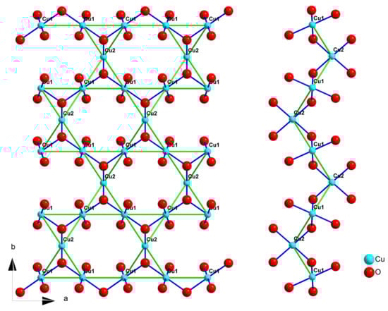 The copper-oxygen net in the crystal structure of Francisite-like compounds crystal structure shown in different direction. Cu–Cu contacts are marked as green. The right part of the figure shows the buckled nature of the kagome net.