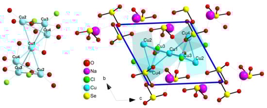 Compound Na2Cu7(SeO3)4O2Cl4 [40,65] is an example of a unique structure. There are four independent Cu crystallographic sites. These atoms form heptanuclear clusters (Figure 22 left panel). The Cu–Cu distances in the clusters are in the range of 2.96–3.25 Å. Every cluster is formed by the two tetrahedra connected by a common vertex. Copper atoms in the vertices have the square planar surrounding [CuO4], two atoms in tetrahedra have the planar coordination [CuO3Cl] and finally one copper atom is surrounded by four oxygen atoms and one chlorine atoms forming [CuO4Cl] triangular bipyramid. Na2Cu7(SeO3)4O2Cl4 displays a three-dimensional network built by isolated [Cu7O14Cl4]18− clusters connected by SeO32− groups (right panel of Figure 22), in which Na+ ions are located inside the vacancies. The same structure was found for the bromide analog Na2Cu7(SeO3)4O2Br4 [64] taking into account that Cu–O and Na–O distances are elongated compared to the chloride compound.