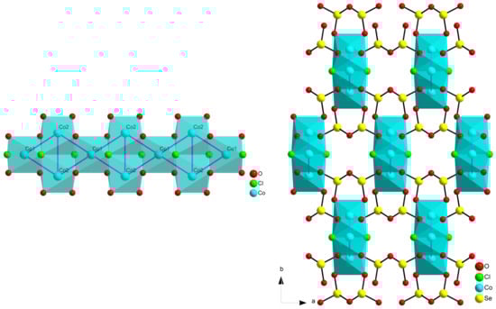 Due to the Jahn–Teller effect, the surrounding of Сu2+ differs from that of Co2+ and Ni2+, and this is the reason for differences between cobalt and nickel compounds and the copper ones. Similar compounds for cobalt and nickel have common structures at least in one form (Table 1, substances 2, 3 and 5 [23,25]). All three metal atoms in the compounds under discussion have a distorted octahedral coordination (Figure 2a). Two atoms have a [MO5X] (X = Cl and Br) coordination and one M atom has a [MO4X2] coordination with the oxygen atoms in the square plane. The O–O edge-sharing [MO5X] polyhedra form chains which are connected via common halogen vertexes into layers in the crystal structures of cobalt and nickel compounds. A three-dimensional structure appears when such layers are bridged by [MO4X2] polyhedrons and SeO32– groups (Figure 2a). The crystal structures of Co5(SeO3)4X2 and Ni5(SeO3)4Br2 have M–M distances in the range of 3.10–3.37 Å for Co5(SeO3)4Cl2 [23], 3.07–3.40 Å for Co5(SeO3)4Br2 [23], and 3.03–3.39 Å for Ni5(SeO3)4Br2 [25].