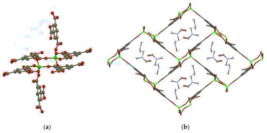 Crystal structure of {Zn-BTC}{Me2NH2+}. (a) The [Zn2(μ-OOC)]2 structural motif. H-atoms are omitted for clarity; (b) The fragment of crystal packing of the {Zn-BTC}{Me2NH2+} MOF system (Zn = green, O = red, C = grey, N = blue, H = white).
