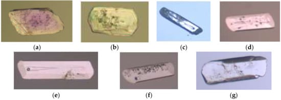 Color and shape of {Zn-M-BTC}{Me2NH2+} crystals doped with (a) Co, (b) Cu, (c) Ni, (d) Mn, (e) Ca, (f) Mg, and (g) Cd.