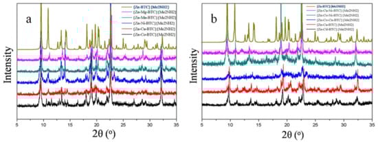 Powder pattern comparison of metal doped system and {Zn-BTC}{Me2NH2+} simulated pattern obtained from single crystal X-ray data (marsh line) for single-metal doped (a) and dual-metal doped (b) systems.