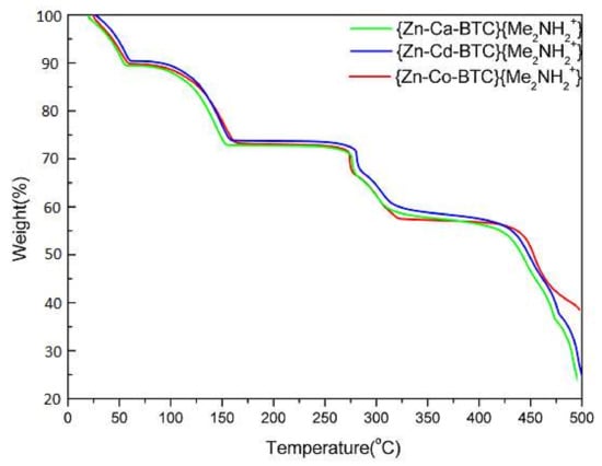TGA curves of {Zn-M-BTC}{Me2NH2+} MOF (M = Co, Cd, Ca).