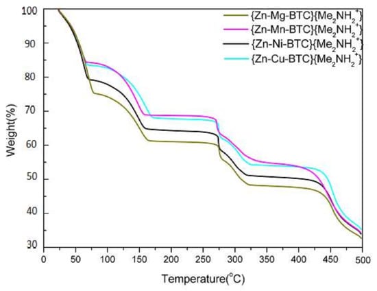 TGA curves of {Zn-M-BTC}{Me2NH2+} MOF (M = Cu, Ni, Mn, Mg).