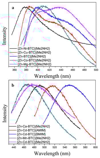Photoluminescence emission of {Zn-M-BTC}{Me2NH2+} (a) and {Zn-Cd-BTC}{AMIM/BMIM} in comparison with {Zn-M-BTC}{Me2NH2+} (b) MOF systems registered in ambient conditions.
