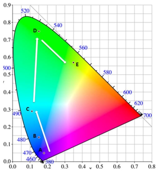 CIE chromaticity diagram of {Zn-M-BTC}{Cation} MOF system: (A) {Zn-Ni-BTC}{Me2NH2+}; (B) {Zn-Mn-BTC}{Me2NH2+}; (C) {Zn-Ca-BTC}{Me2NH2+}; (D) {Zn-Cd-BTC}{AMIM}; (E) {Zn-Cd-BTC}{BMIM}.
