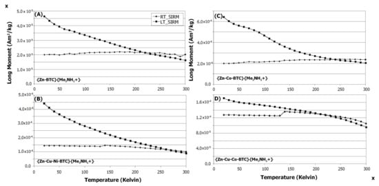 Room temperature saturation isothermal remanent magnetization (RT_SIRM) and low-temperature SIRM (LT_SIRM) experiments for {Zn-BTC}{Me2NH2+} (A); {Zn-Cu-Ni-BTC}{Me2NH2+} (B); {Zn-Co-BTC}{Me2NH2+} (C); {Zn-Cu-Co-BTC}{Me2NH2+} (D).
